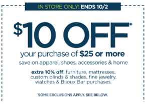 Fine Print: Receive $10 off select original, regular, sale and clearance-priced apparel, shoes, accessories and home purchases of $25 or more. Extra 10% off select original, regular, sale and clearance-priced furniture, mattresses, custom blinds & shades, fine jewelry, watches and Bijoux Bar purchases. Each offer good in store only, excluding taxes